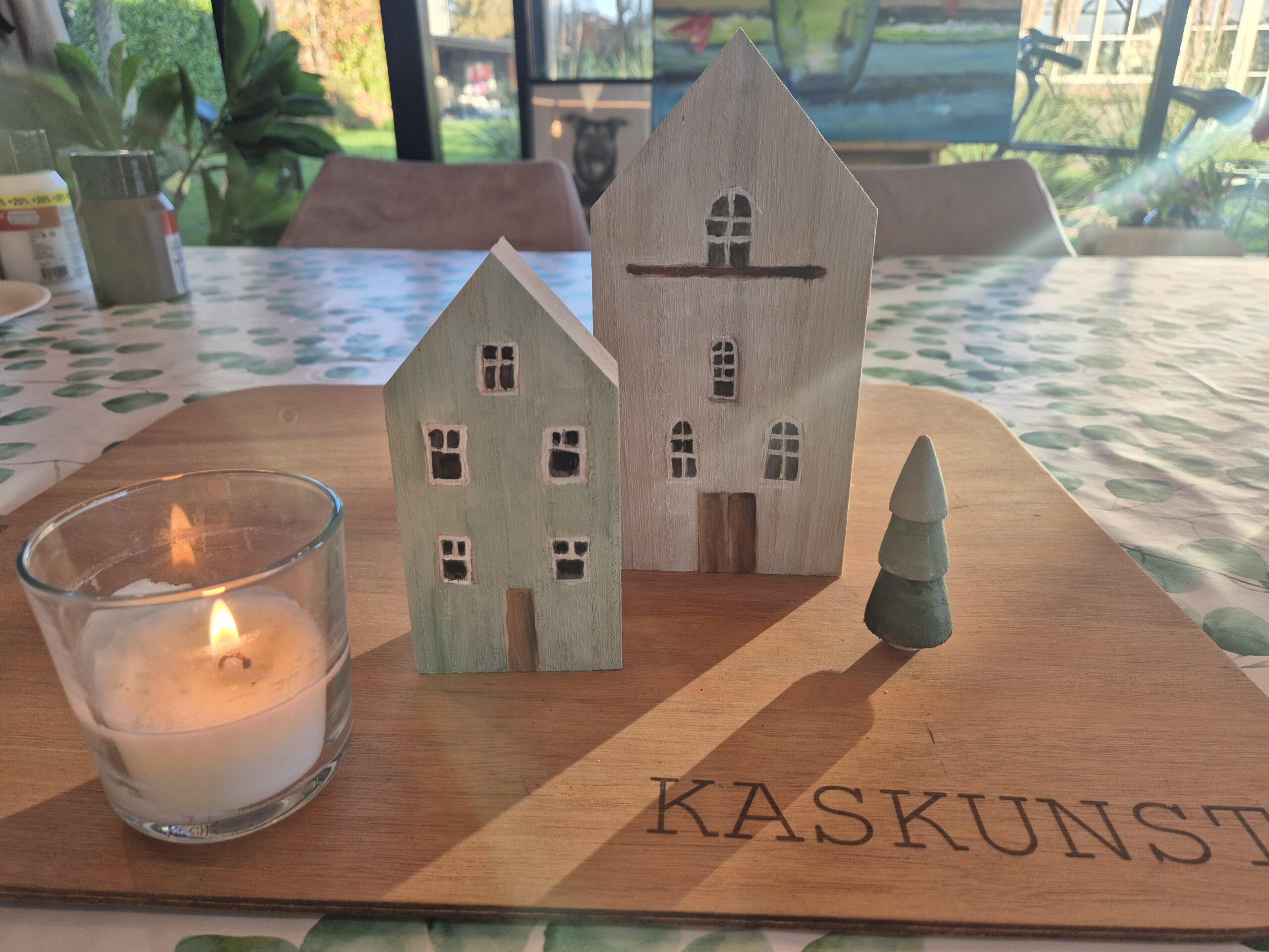 In deze workshop beschilderen we 2 houten kersthuisjes.